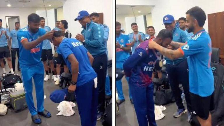 After defeating Nepal by 10 wickets in the Asia Cup 2023 encounter at the Pallekele International Stadium in Kandy, Team India thanked the Nepal cricketers in the locker room. After hearing passionate comments from Nepal coach Monty Desai, Virat Kohli, Hardik Pandya, and head coach Rahul Dravid, gave medals to three players.