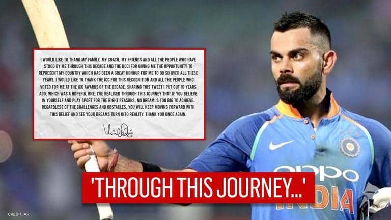 Indian skipper Virat Kohli thanked his family, coach, friend and other as he was adjudged the ICC Men’s Cricketer Of The Decade on Monday morning.