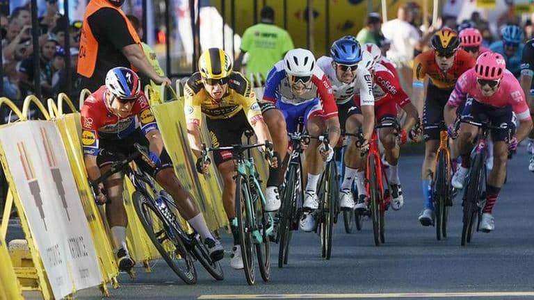 Groenewegen crossed the line in first place then hit the tarmac in a mass crash.