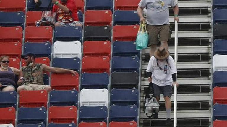Fans had to go through screening and wear masks to get in for the race, though a few were walking around inside without theirs on. But lines seemed to flow quickly and the sun was shining until about an hour before the race, when rain and lightning started.