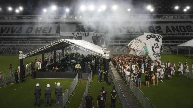 Pelé's coffin, draped in the flags of Brazil and the Santos FC football club, was placed on the midfield area of Vila Belmiro.