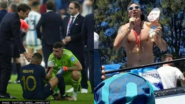 Argentine goalkeeper Emiliano Martinez has remained in the news for poking fun at French youngster Kylian Mbappe, ever since Argentina defeated France 4-2 in the penalty shootout to win the FIFA World Cup Qatar 2022. As the Argentine team celebrated the World Cup glory in the streets of Buenos Aires on Tuesday, Martinez was seen taking another jibe at the 24-year-old Frenchman. In pictures that are currently going viral on social media, the goalkeeper can be seen holding a doll with Kylian Mbappe’s face over it.