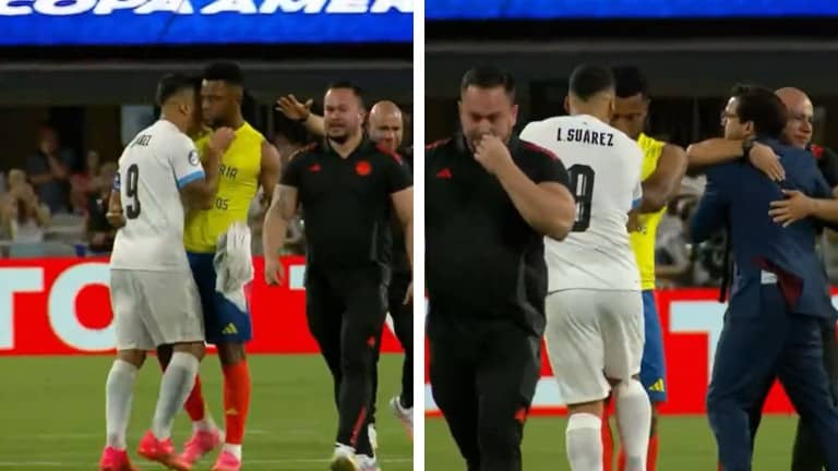 Fans react passionately to footage showing Luis Suarez's intense involvement in the clash during the Colombia vs. Uruguay match, describing him as remarkable.