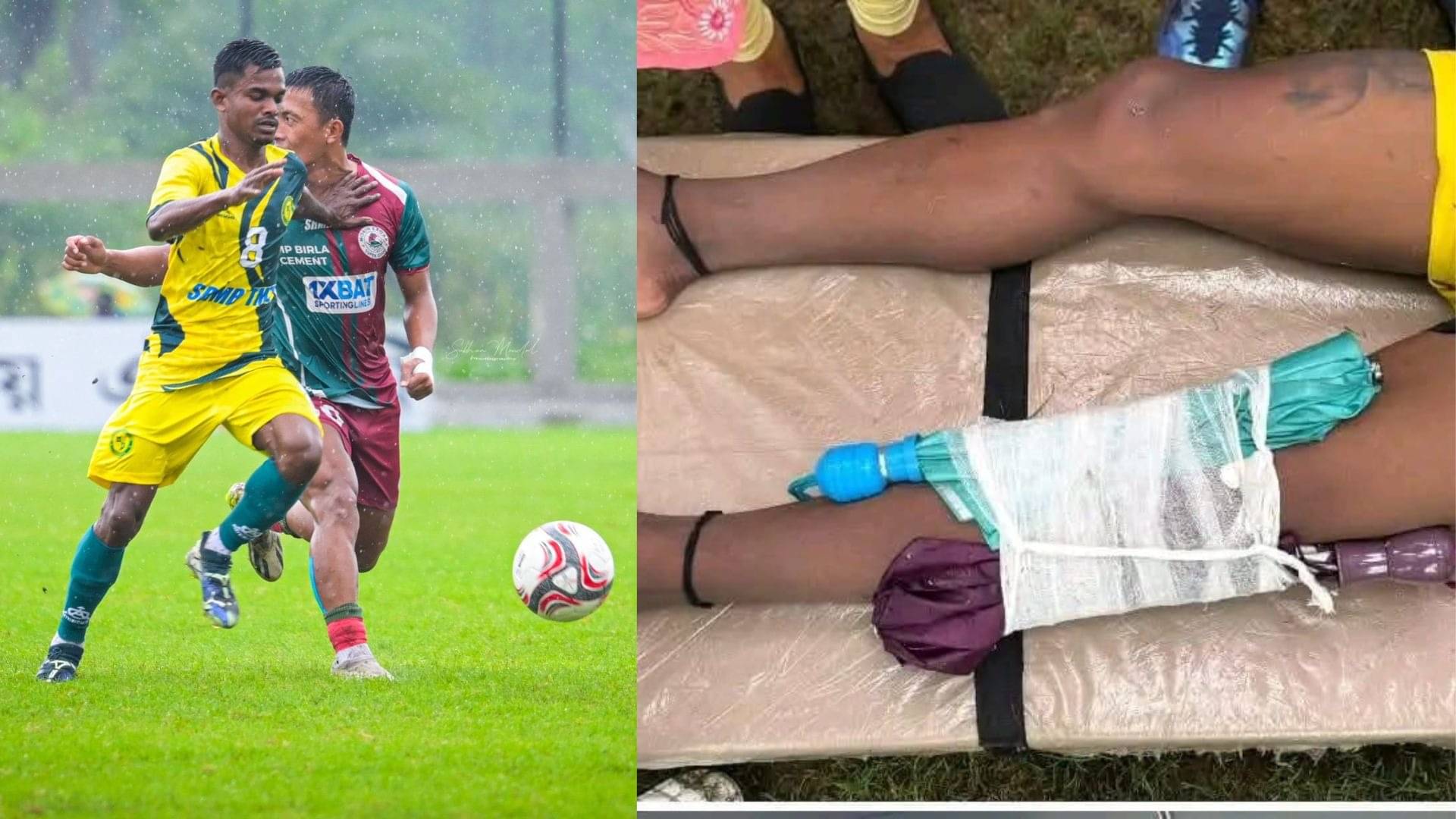 Indian footballer Tarak Hembram fractured his leg during a Calcutta Football League match vs Mohun Bagan, and his injury was shockingly treated using umbrellas to hold his leg in place.