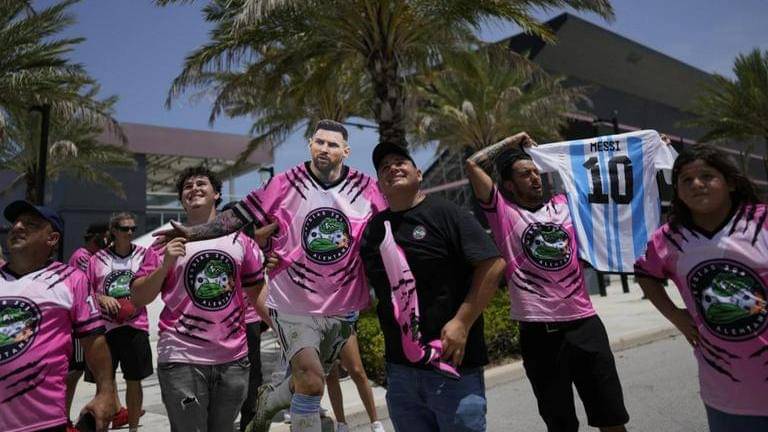 The club had a road match Saturday at St. Louis, yet when word got out that Messi may have been at the team’s facility that morning a couple hundred fans showed up just hoping for a glimpse, not even deterred by a late-morning thunderstorm. Many wore Messi jerseys — some the light blue of Argentina, some the pink-and-black of Inter Miami. Some carried flags; one carried a sign mostly in Spanish, but the words “Messi” and “GOAT” made the messaging clear.