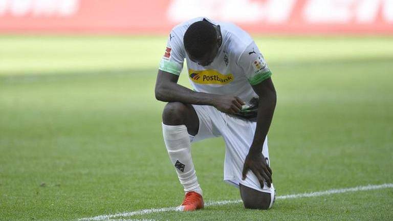 The Gladbach forward was left free at the far post to score the home side’s second goal with a header in the 41st minute. He briefly accepted teammates’ congratulations, then dropped his left knee to the ground and rested his right arm on his right thigh as he bowed his head in reflection. He spent five seconds in this position before getting up again to continue.