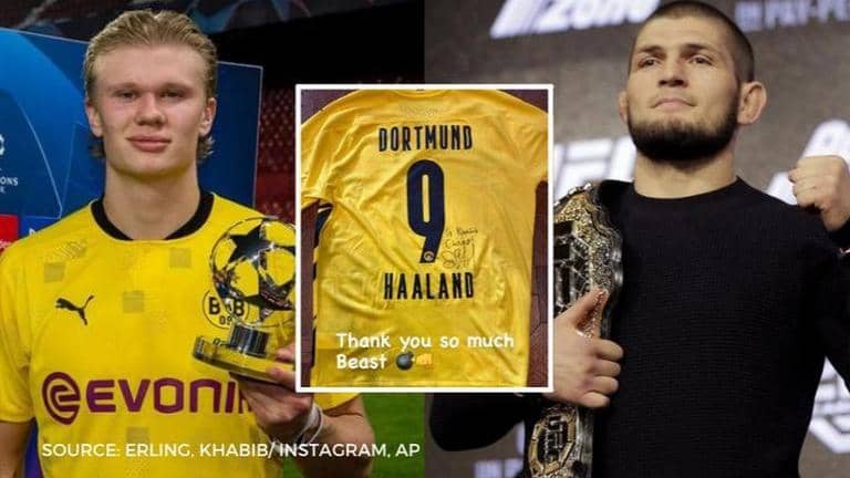UFC lightweight champion Khabib Nurmagomedov recently took to Instagram and shared a story of the shirt he received from Borussia Dortmund star Erling Haaland.