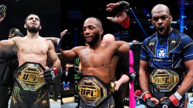 Islam Makhachev, Leon Edwards and Jon Jones with their UFC titles (Image: @ufc/@ufceurope/Twitter) | Image: self