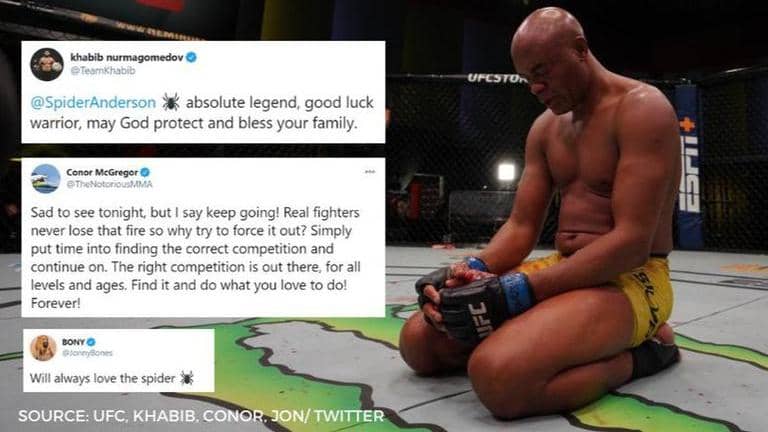 Later, many of Silva's colleagues, including former double champion Conor McGregor, current undefeated lightweight champion Khabib Nurmagomedov, former light heavyweight champion Jon Jones and others, took to social media to praise The Spider. While Khabib Nurmagomedov wished Anderson Silva good luck by calling him a “warrior” and an “absolute legend,” Jon Jones tweeted that he’ll always “love the Spider”. Conor McGregor, on the other hand, wrote that he was sad to see Anderson Silva fight in his last UFC bout.