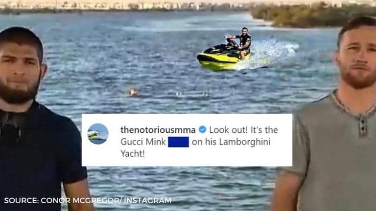 Though Conor McGregor is not a part of UFC 254, he made his presence felt as he targeted lightweight champ Khabib Nurmagomedov and interim champ Justin Gaethje ahead of their much-awaited unification bout. The Notorious One took a still from the UFC 254 pre-fight presser and showed off his editorial skills on the image. The pre-match press conference took place at Yas Island, Abu Dhabi. Conor McGregor evidently took notice of the sandy location and added one of his photos where he can be seen riding a jet ski in the background while Khabib Nurmagomedov and Justin Gaethje pose for the media.
