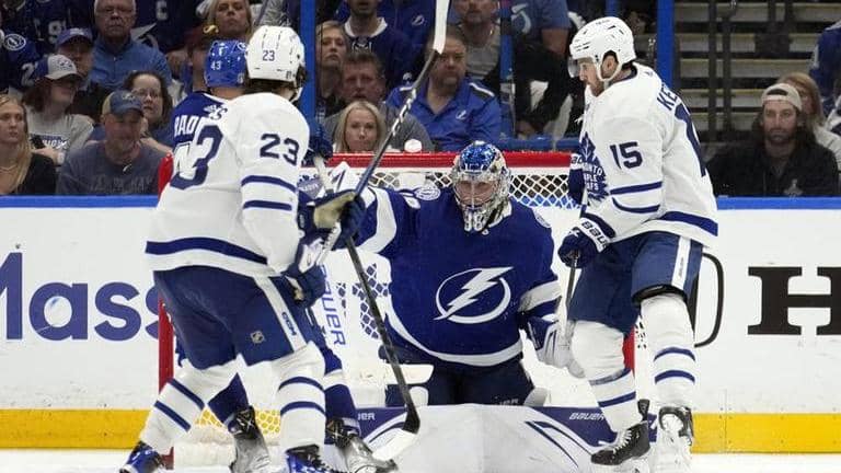 Noel Acciari scored for the second straight game for Toronto, deflecting Juston Holl’s shot past Vasilevskiy early in the second period to briefly get the Maple Leafs within one goal before Tampa Bay pulled away with goals by Stamkos and Killorn that made it 4-1.
