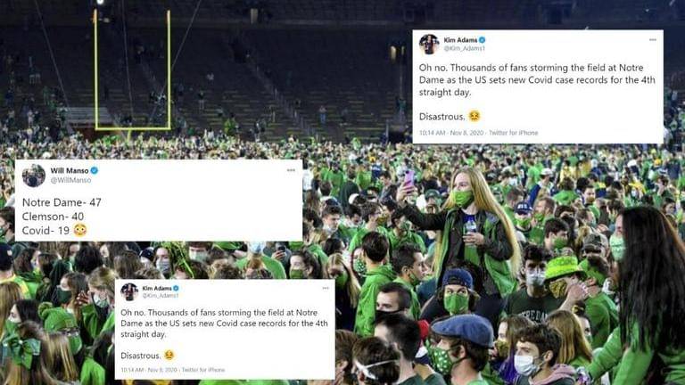 Sunday, November 8, was a historic night for Notre Dame's football team as Fighting Irish scored a double-overtime, 47-40, victory over the nation’s top-ranked team, the Clemson Tigers. The team's post-game celebration, however, soon turned sour after thousands of fans poured onto the field to celebrate the massive wins with the players. Within minutes, the football field in Notre Dame Stadium in Indiana had over 10,000 fans, with several fans spotted without masks.