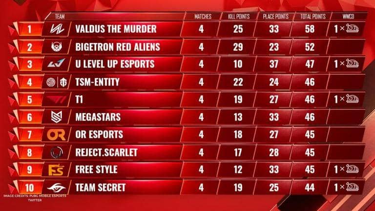| Team | WWCD | Kills | Points | |