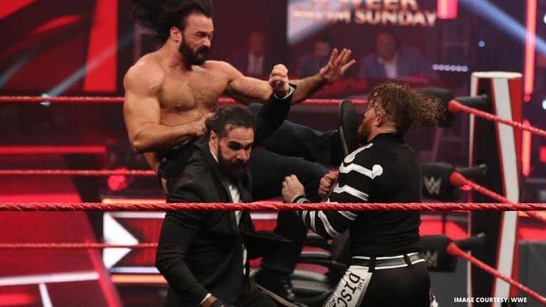 Drew McIntyre took out his jacket and was ready to hit Seth Rollins with a Claymore Kick, but Buddy Murphy appeared and attacked him from behind. Buddy Murphy then helped Seth Rollins to get up. McIntyre tried to hit Rollins with a Claymore, but Rollins dodged and the Claymore hit Murphy. Seth Rollins then ran out of the ring as the WWE Champion laughed.