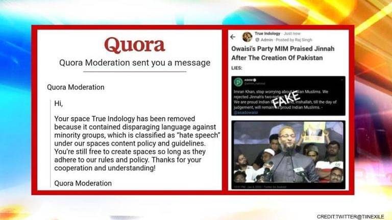 Recently, True Indology wrote about Jinnah praising Owaisi's party, which was classified as a hate speech by Quora. True Indology then shared the screenshot of what was posted and claimed there was no hate speech and further stated 'facts' with a letter proof.
