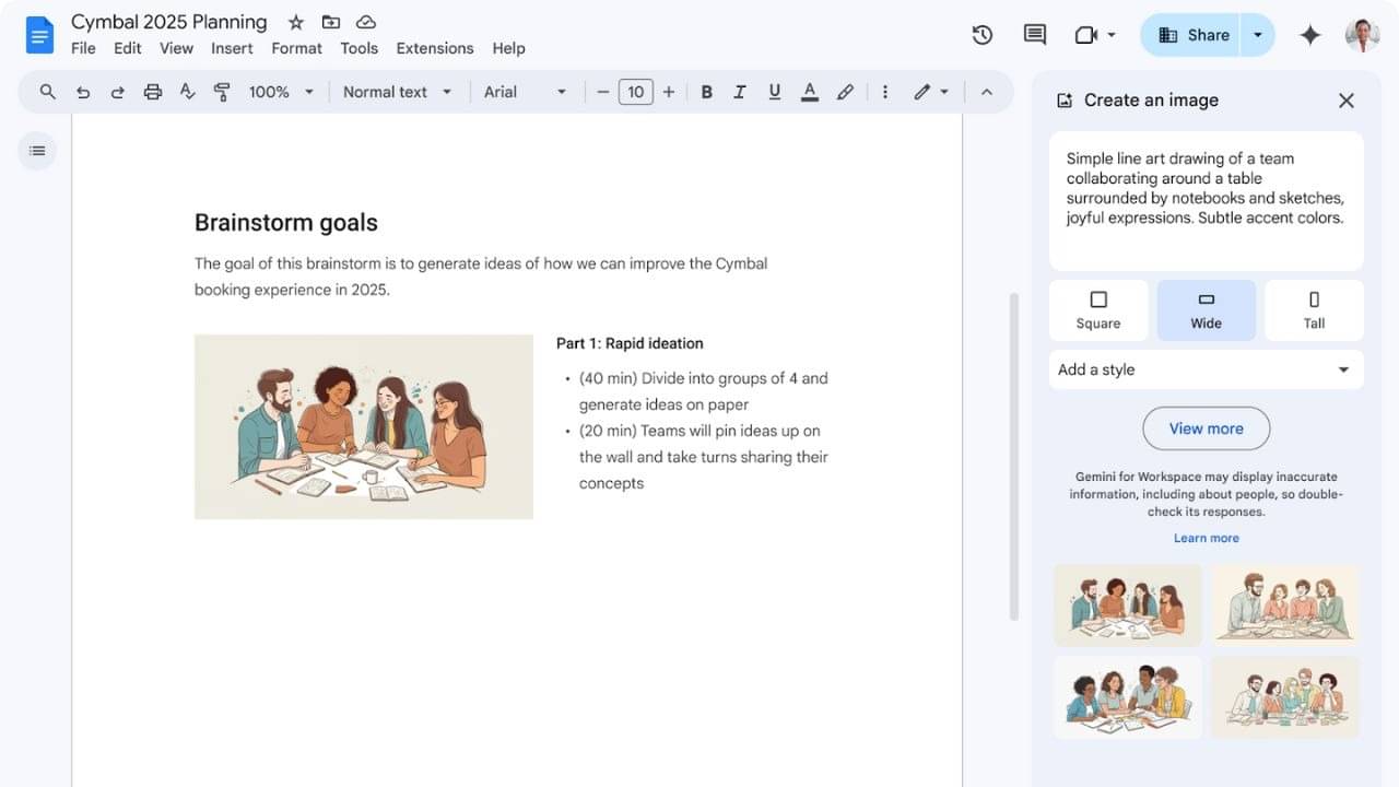 The Gemini integration in Google Docs lets users create "photorealistic images of people, landscapes, and more with even better detail than before." Powered by Google's Imagen 3 image generation model, the new image generation capabilities offer customisation for image size, aspect ratio, and photography styles, such as watercolour. "You can further customise your document by creating a unique cover image using Gemini in Docs, which can add flavour to a résumé, stylise an invitation, or personalise a client pitch," said Google in a blog post.