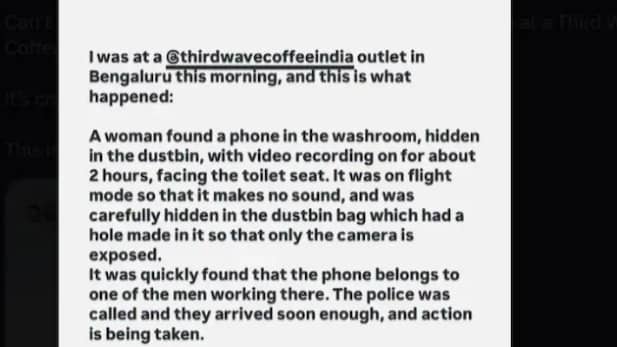 An Instagram handle 'Gangs Of Cinepur' posted a story where an eyewitness said, "While at the Third Wave Coffee outlet in Bengaluru, a woman discovered a phone hidden in the restroom's dustbin, recording video for approximately two hours aimed at the toilet seat. The phone was set to flight mode to remain silent."