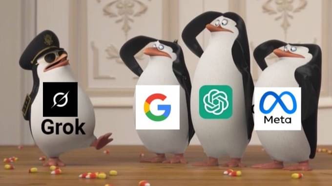In the post, Musk claims that Grok outshines other AI chatbots, using a humorous meme from an animated movie'Madagascar', features three penguins saluting, with one wearing a captain's hat.