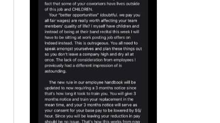 He wrote, "Your ‘better opportunities’ (doubtful. we pay you all fair wages) are really worth affecting your team members’ quality of life? I myself have children, and instead of being at their band recital this week, I will have to be sitting at work posting job offers on Indeed. This is outrageous."