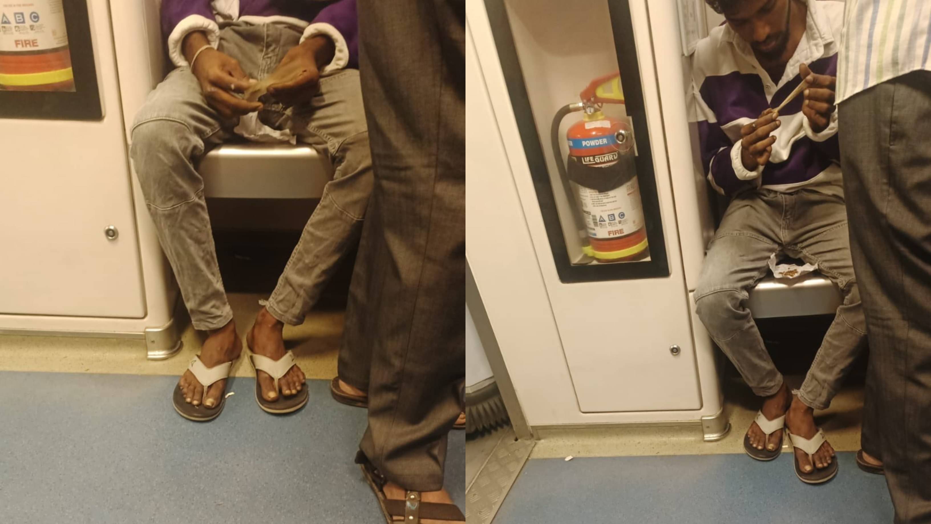 A shocking image that surfaced capturing a man openly rolling a ganja cigarette amidst a crowded Chennai Metro train went viral on social media.