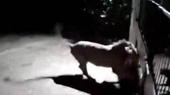 The video then shows a dog fearlessly checking if the lions were still there. Later, a watchman with a torch closes the gate, and the dog goes to his side.