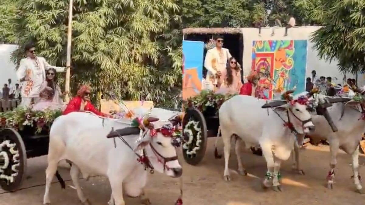 Bhopal: Madhya Pradesh Chief Minister Mohan Yadav's son Dr Abhimanyu Yadav got engaged to Dr Ishita Patel in a ceremony held in Ujjain on Saturday. The simplicity of the event turned heads as the couple made an entrance to the venue in a unique style. Instead of luxury cars, the couple arrived at the venue on a bullock cart accompanied by the sounds of traditional dhol.