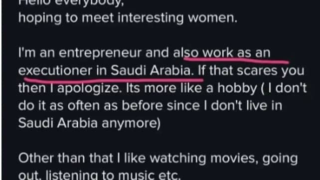 The man, described as an "executioner, entrepreneur, and business owner," wrote in his "About Me" section, "Hello everybody, hoping to meet interesting women. I'm an entrepreneur and also work as an executioner in Saudi Arabia. If that scares you, I apologize. It's more like a hobby (I don't do it as often as before since I don't live in Saudi Arabia anymore)." He added, "Other than that, I like watching movies, going out, listening to music, etc."