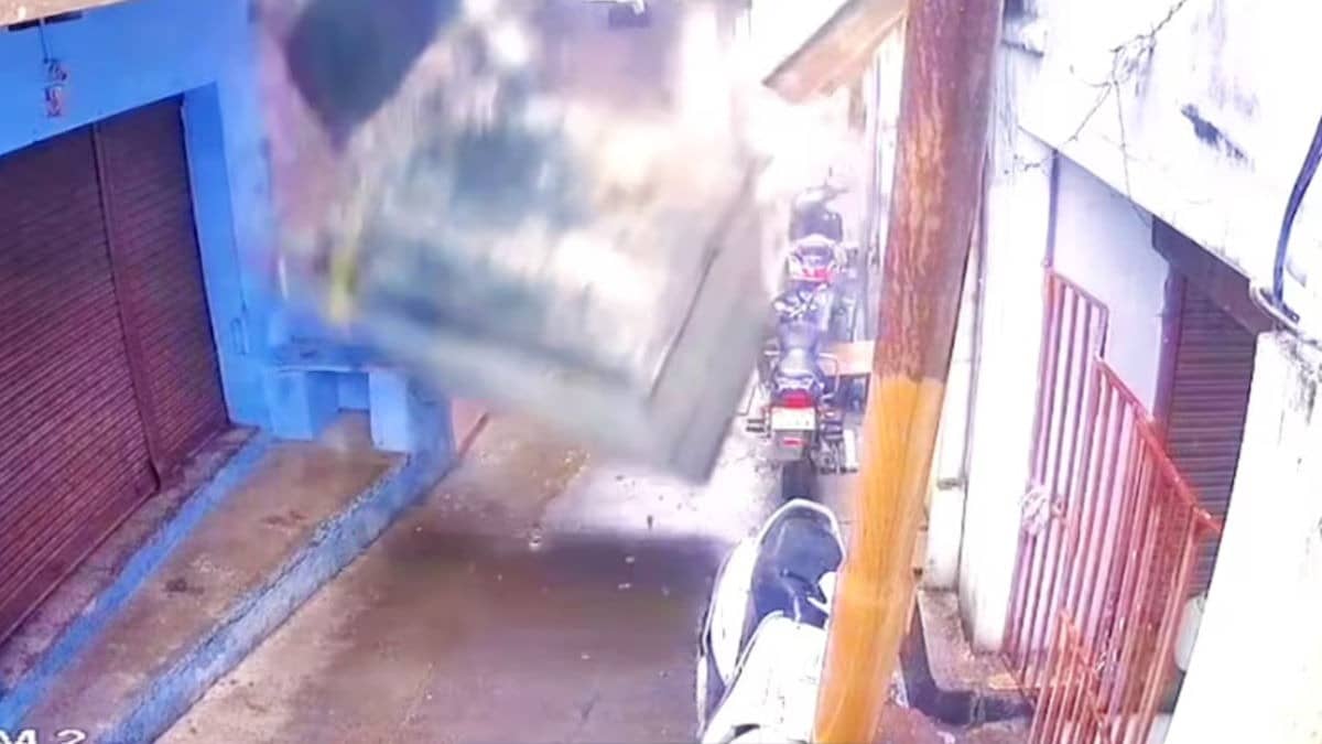 In Shajapur, Madhya Pradesh, a portion of the Maharaja Hotel's first-floor washroom collapsed onto the street, completely crushing a parked scooter. Fortunately, no one was injured.