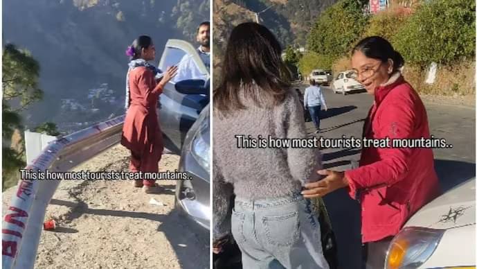 In a viral video shared by Shinjini Sengupta, a woman and a man, celebrating a birthday at Lover’s Point in Nainital, were caught throwing used tissues and a cake bag onto the road. Sengupta’s sister, who was there, politely asked them to dispose of the waste properly. According to Sengupta, the woman in red claimed there was no dustbin nearby, despite one being just 5 feet away. When a local shopkeeper also asked them to dispose of the trash properly and warned about police fines for littering, the man threw a plastic bag into a nearby valley. The situation quickly escalated, sparking a heated argument.