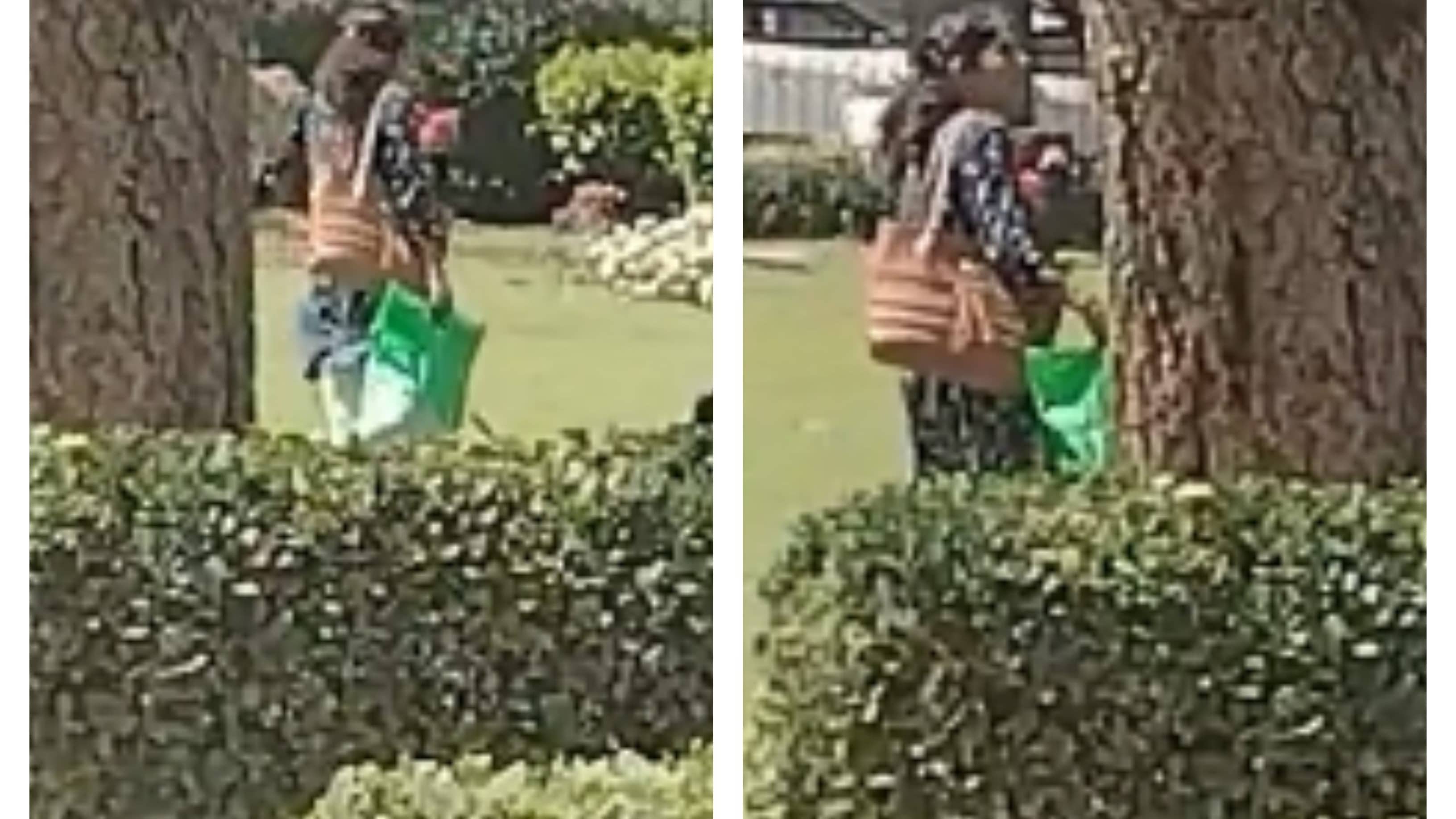 The video shows the woman walking through the garden with multiple bags in her hands. She plucks roses from the campus before being stopped by a group of people.