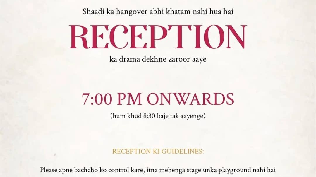 A wedding invite of “Sharma Ji ki Ladki” and “Gopal Ji ka Ladka” has gone viral on social media for its witty and unconventional approach to Indian wedding norms.
