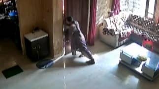 The video starts with the woman running toward the main door as she assesses that someone is trying to enter. She wisely first locked the door with the help of an upper hinge and then pushed the door to prevent the robbers from entering. In a few seconds, the video shows the door being pushed from the outside, which was thwarted by the woman's determination. Then she locked another hinge on the lower side of the door.