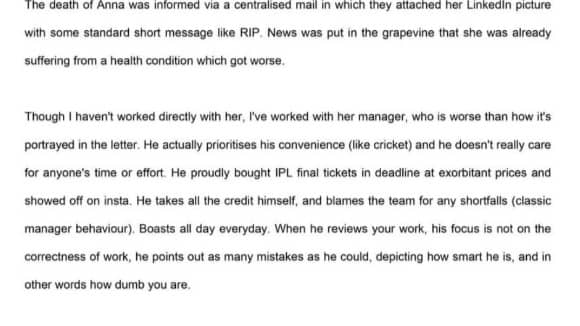 In her statement, the colleague wrote: "Though I didn’t work directly with Anna, I worked with her manager, who is worse than portrayed. He prioritizes his convenience over work, flaunting his IPL final tickets while demanding deadlines. He constantly takes credit and blames the team for any shortfalls, criticizing work just to showcase his superiority."