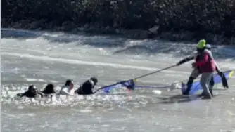 In the viral video, tourists stuck in the ice lake can be seen rescued by the fellow tourists. Fellow tourists rescued them with the help of bamboo sticks, pulling them out one by one.