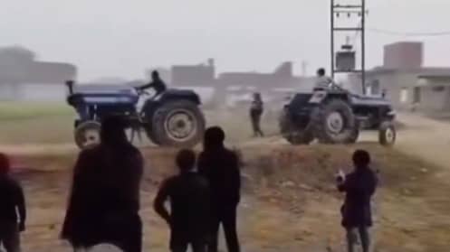 Bulandshahr: A shocking video has surfaced on social media that shows two individuals performing dangerous stunt on their tractors in UP's Bulandshahr.