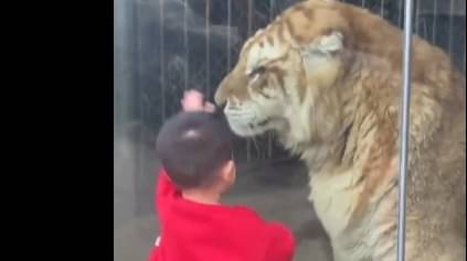 The video reportedly comes from a zoo in eastern China. The gigantic tiger is seen playfully responding to the toddler's "paw-punching" through its enclosure.