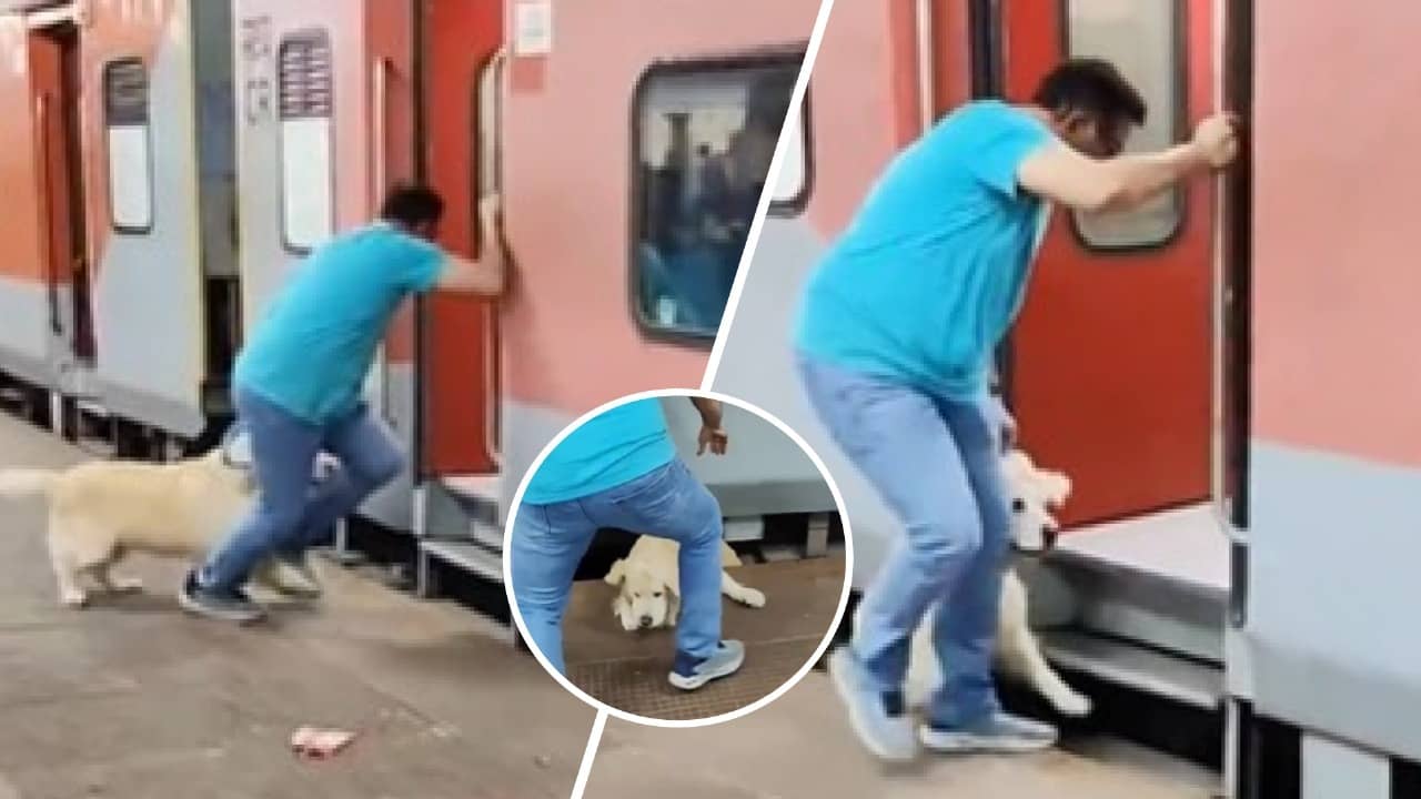 The video, shared on X, shows a man in a blue t-shirt trying to board the train while holding his dog. Unfortunately, he fails to get on, and the dog falls onto the train tracks, causing panic among onlookers.
