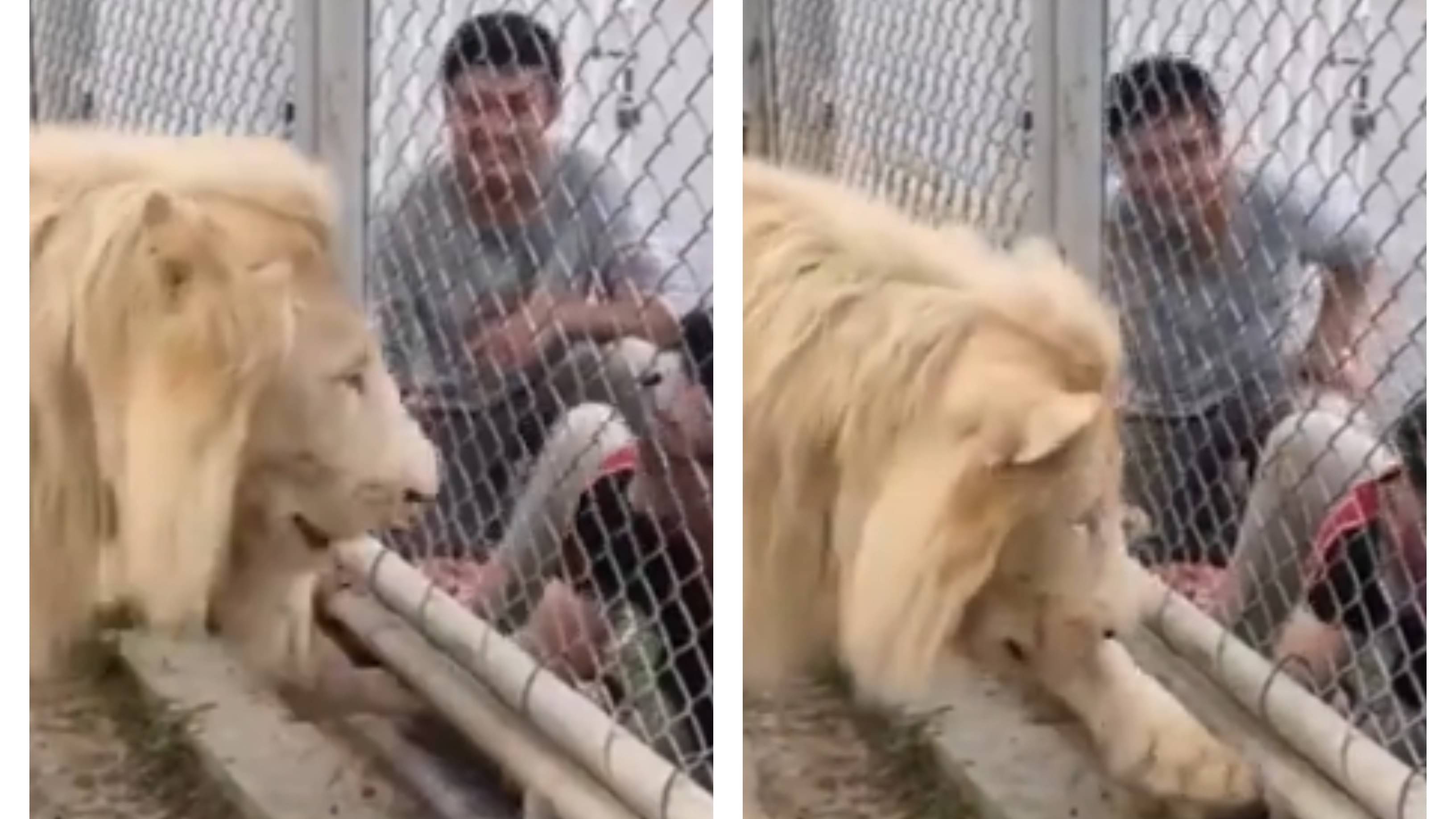 The clip captures two men outside the cage at the zoo, placing their hands inside the lion's enclosure without much hesitation. One can be seen taking a picture by putting his hand inside the lion's cage.