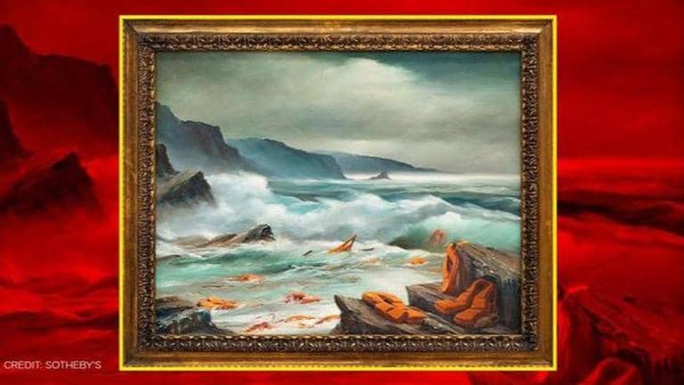 Acclaimed anonymous street artist Banksy has donated three oil paintings on the European migrant crisis to a charity auction to raise money for a hospital in Bethlehem, a Palestinian town in the West Bank. One of the triptychs, titled Mediterranean Sea View 2017, depicts the death of migrants by adding life jackets and buoys on the 19th century-style Romantic seascapes.