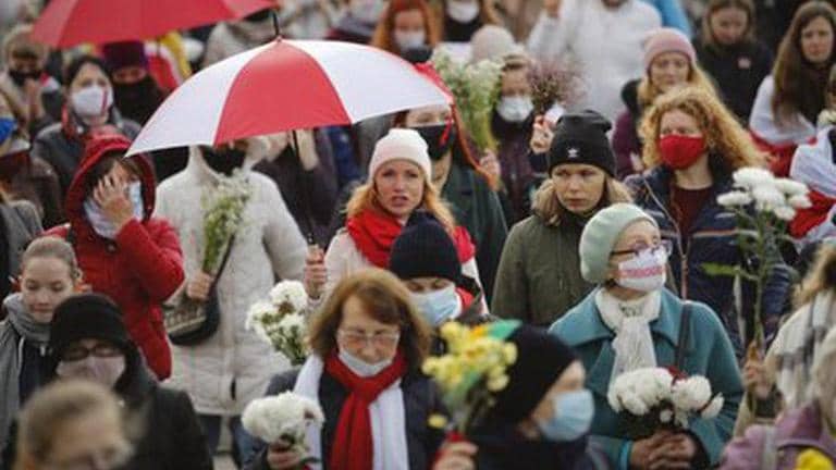 On Saturday, women who marched in Minsk carried umbrellas in the white and red colors of the opposition flag.