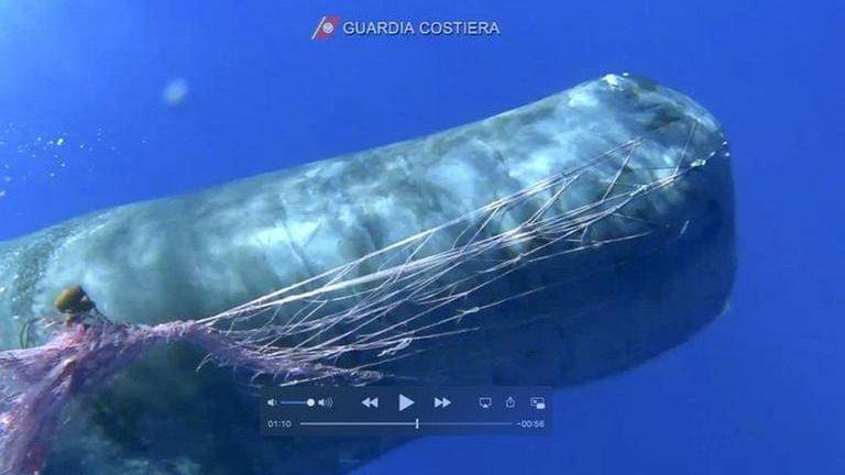 Divers and biologists fought for hours over the weekend to free a sperm whale trapped in an illegal fishing net almost 14 miles (22 kilometres) off the Italian island of Salina, north of Sicily.