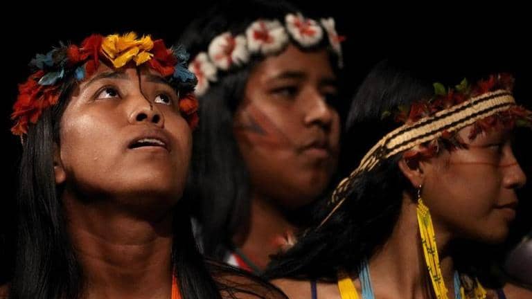 The setting seemed symbolic: a theater displaying European décor -- French chandeliers, Italian marble busts and a massive painting across the ceiling depicting Greek deities. It was built during the rubber boom, with fortunes amassed with raw material from deep in the Amazon, and little care for what its extraction implied for local communities. There is no trace of them in the so-called Theater of Peace -- except on Monday many of their descendants could be found from the floor seats up to the balcony boxes, wearing tribal vestments.