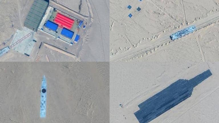 China has built full-scale mock-ups of US warships in a desert in the country's northwestern region of Xinjiang according to the satellite photographs revealed by a US space technology company, Maxar. The image depicts structures fashioned like a military aircraft carrier set on rail lines. As per the reports of USNI News, the structures seemed to be military objectives, a site devoted to the US Navy. The constructions observed in the Taklamakan Desert looked to have flat outlines of US military warships with no armaments or other specifics.