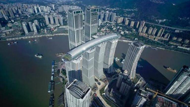 China has opened the 250-meter-tall sky bridge called The Crystal that connects four of the eight skyscrapers that make up the Raffles City Chongqing complex to the public on June 13. One of the most anticipated attractions, The Exploration Deck on The Crystal was unveiled to the public. Dubbed as the ‘Horizontal Skyscraper’ the landmark is a multi-use riverside complex with aerial walkways in the southwest China megacity designed by famous Singapore's Changi Jewel Bridge architect, Moshe Safdie.