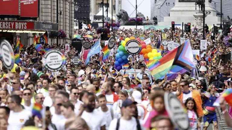 Banners being shown in the parade read, among others, "Stand together, love together," and "No pride in war, no pride in nations."