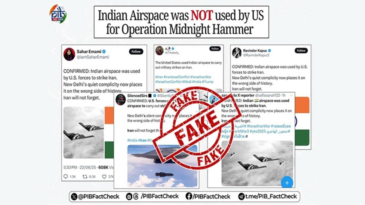 In a post on its X handle, PIB Fact Check, the PIB has shared screenshots from some user accounts that claimed that the US forces used Indian airspace to strike Iran's nuclear sites and stated, "Several social media accounts have claimed that Indian Airspace was used by the United States to launch aircrafts against Iran during Operation. This claim is fake. Indian Airspace was not used by the United States during Operation."