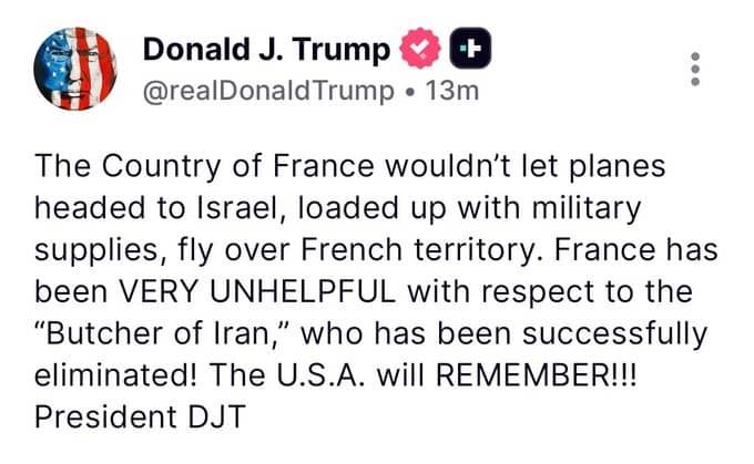 “France has been VERY UNHELPFUL with respect to the “Butcher of Iran,” who has been successfully eliminated! The U.S.A. will REMEMBER!!!,” he said in a post Tuesday after France reportedly closed its airspace for Israeli military planes.