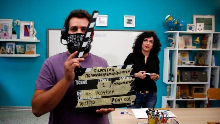 Instead of waiting for the school bell to ring, grade school teacher Rania Koukli now waits for a clapper board to start her class. Koukli is one of the teachers recruited to film a series of lessons in empty classrooms. They're broadcast on public television as part of the government's drive to shift education online to cope with an alarming rise in COVID-19 infections.