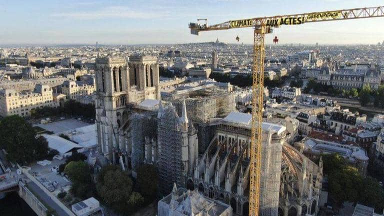 Greenpeace activists hung banners from a huge construction crane atop Notre Dame Cathedral in Paris on Thursday, accusing France and President Emmanuel Macron of not doing enough to fight climate change.