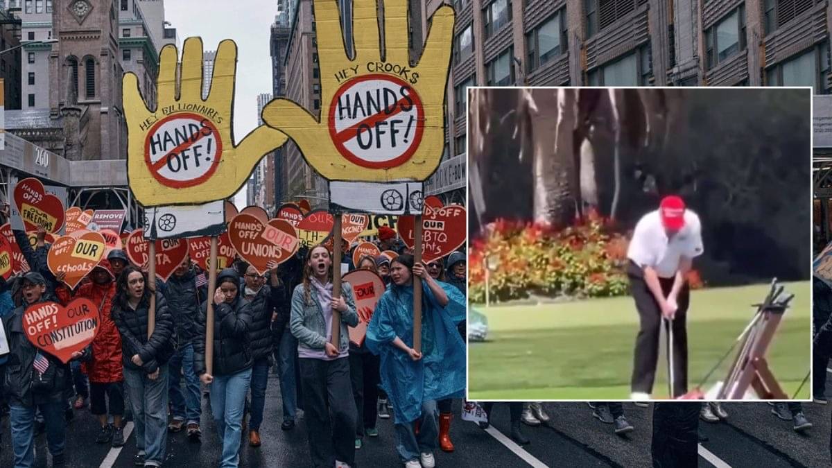 Washington: As thousands of Americans hit the streets in protest, US President Donald Trump chose to spend his weekend playing golf. A statement issued by the White House confirmed that Trump won his second-round matchup at the Senior Club Championship in Jupiter, Florida, and is set to advance to the final round. More than 1,200 ‘HandsOff’ protests just took over America, as streets filled with people just like during Trump’s first term.